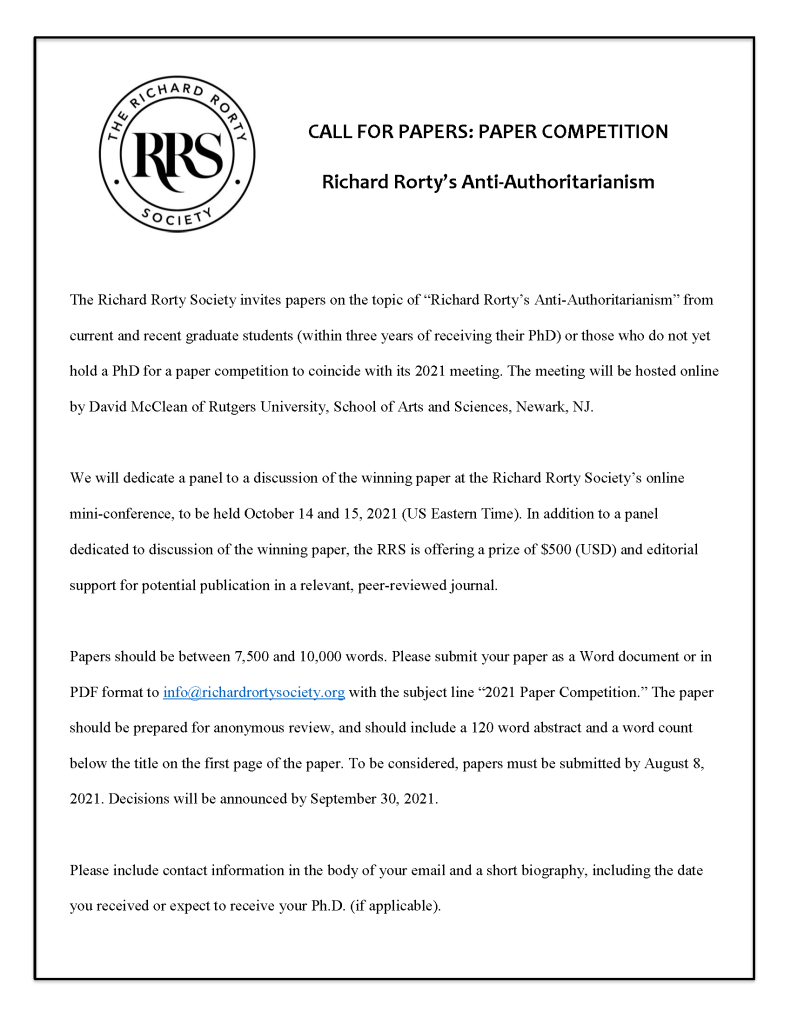 For questions regarding the special issue/section, please contact the two guest co-editors Sergio Gallegos Ordorica and Paul Showler at rortyspoliticsspecialissue@gmail.com.